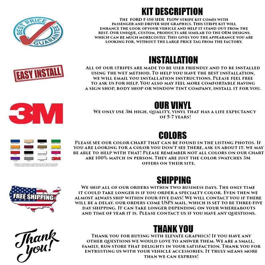 Fitment Years & Models : The Side Flow stripe kit, is a one of a kind, professional Elevate Graphic pro series. This vinyl graphics and decal kit is compatible with any Ford F-150 models XL, XLT, Lariat, King Ranch, Platinum, Lightning, Limited, V8 or V6, Crew Cab, Quad Cab, Regular Cab will fit years 2009, 2010, 2011, 2012, 2013, 2014, 2015, 2016, 2017, 2018, 2019, 2020, 2021, 2022, 2023, and 2024.