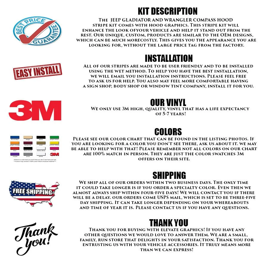 Fitment Years & Models : The Jeep Gladiator/Wrangler Compass Hood stripe kit, is a one of a kind, professional Elevate Graphic pro series design. This vinyl graphics and decal kit fits any Jeep Gladiator/Wrangler model, Sport, Willys Sport, Sport S, Willys, Freedom, Overland, Mojave, Rubicon, and High Altitude. will fit Gladiator years 2019, 2020, 2021, 2022, 2023, 2024.